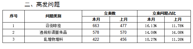 本月与上月对比,从整体来看,城市管理问题立案数量略有上升。各县区、各相关单位针对发现的问题,要进一步加大执法管理力度,抓好问题整改,盯紧重点难点,尤其是对一些易反弹的问题,有针对性地组织开展整治活动,推动市容市貌、人居环境质量进一步提升。